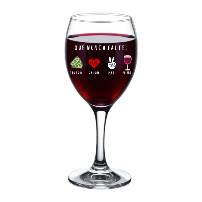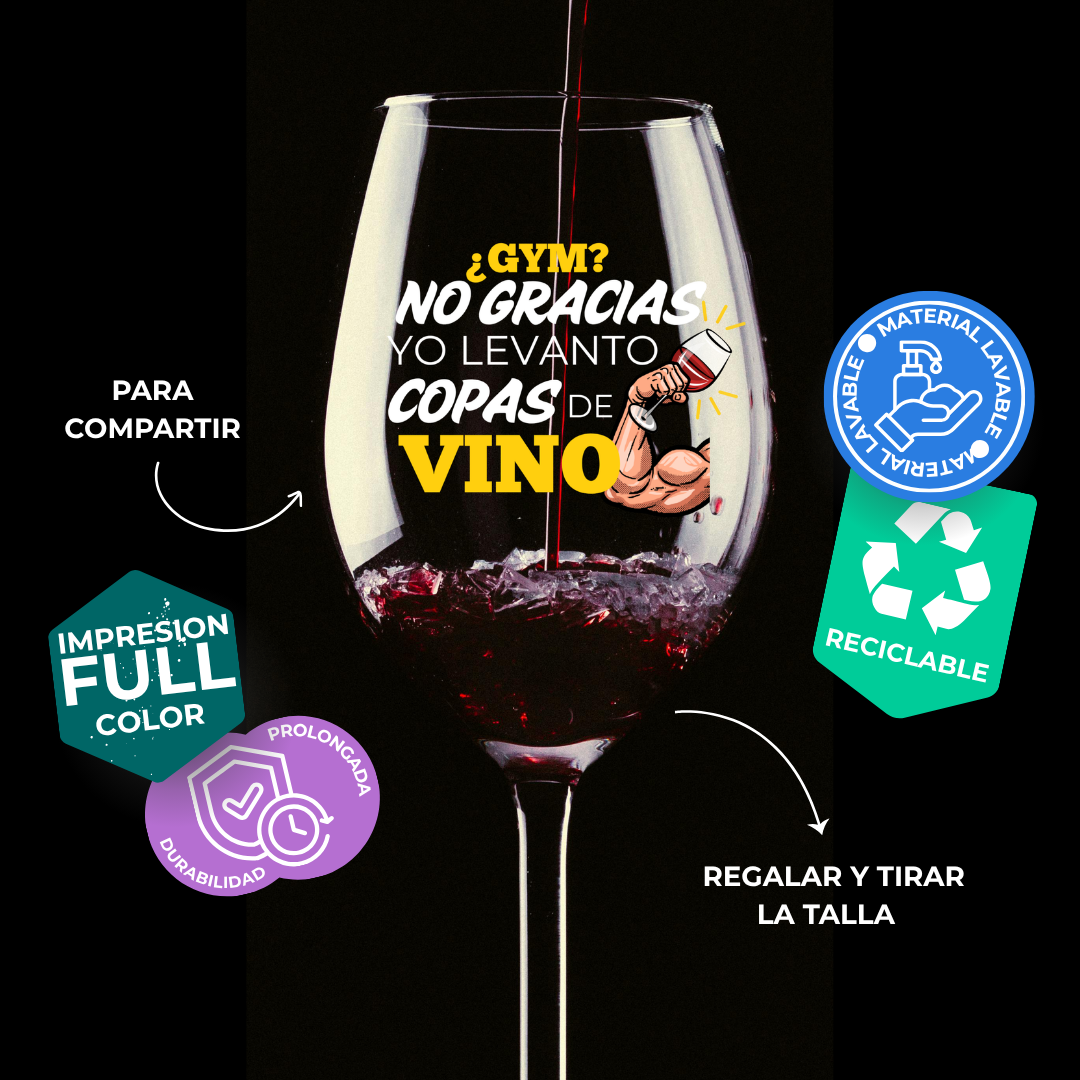 Copa de vidrio, con diseño en Full color de la frase » ¿GYM? no gracias, yo levanto copas de vino «, Diseñado especialmente para amantes del vino.
