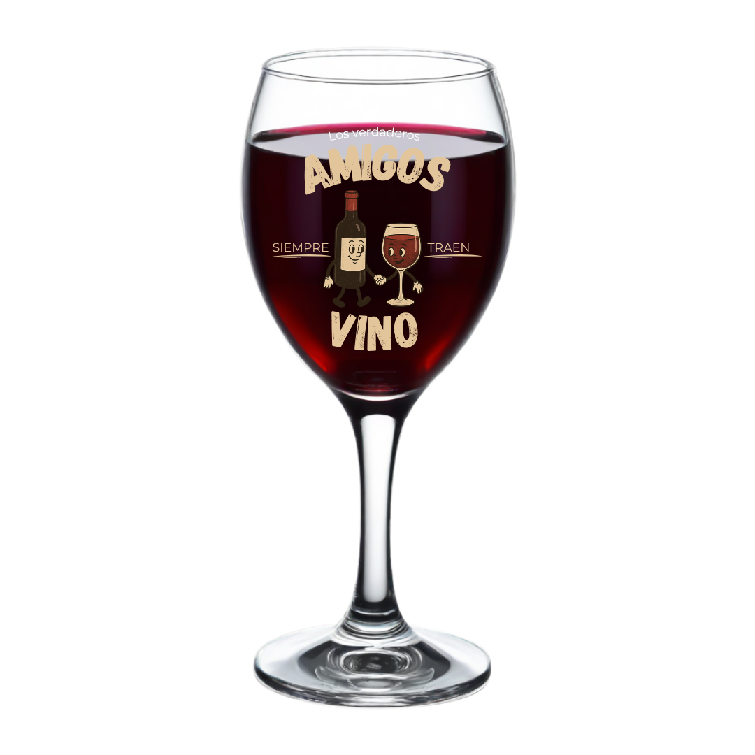 Copa de vino con frase » Los verdaderos amigos siempre traen vino «