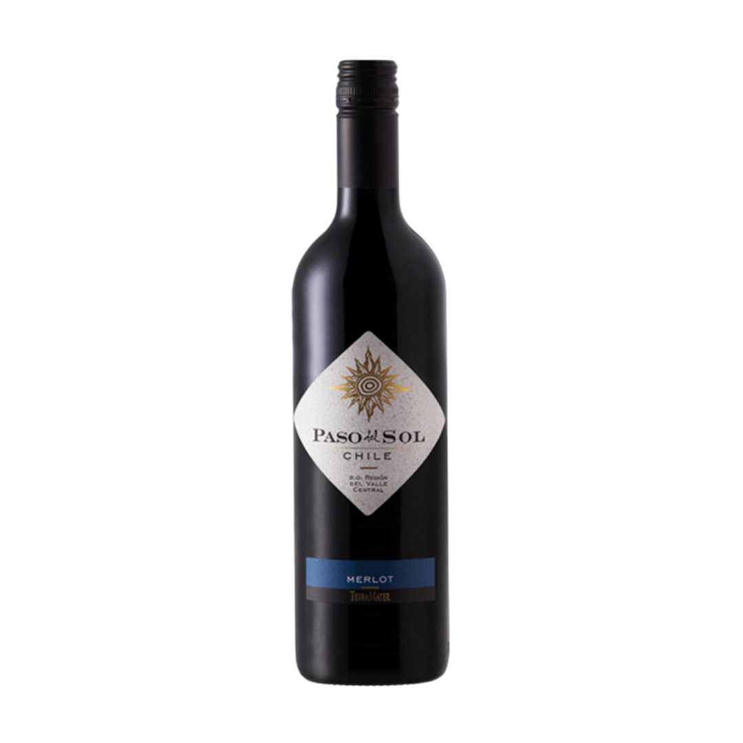 El vino Paso del Sol Merlot, producido por la viña chilena TerraMater en el Valle Central, es un tinto varietal de estilo fresco, frutal y ligero. Con un precio accesible, destaca por sus notas de frutos rojos y negros, un color rojo violáceo y un final suave. Es ideal para consumo cotidiano o acompañar carnes rojas y de caza.